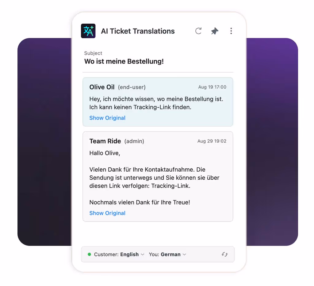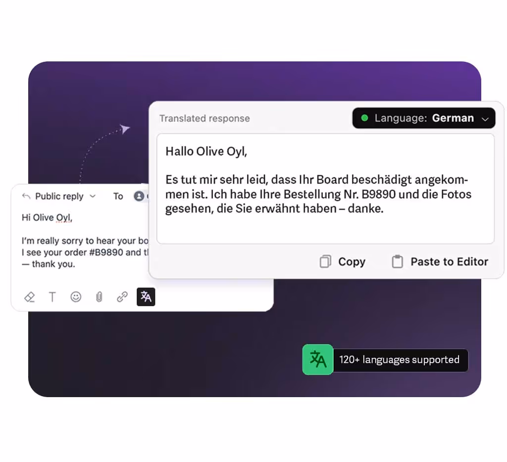 No external tools. No copy-pasting. No delays.Deliver a truly global support experience — with the team you already have.