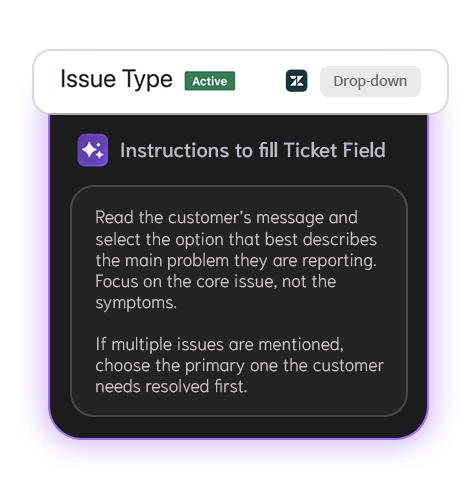 Tell the AI exactly how to fill each ticket field. You can set unique rules or let the AI decide based on ticket context.